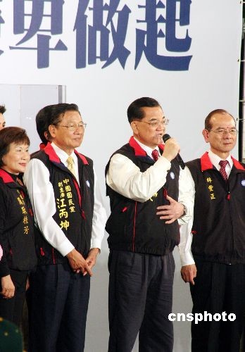 3月22日,中国国民党候选人马英九、萧万长在台湾地区领导人大选中以221万票的领先优势获胜,大批支持者在马萧竞选总部前集会欢庆。图为中国国民党荣誉主席连战在集会现场发表演讲。中新社发 黄少华 摄