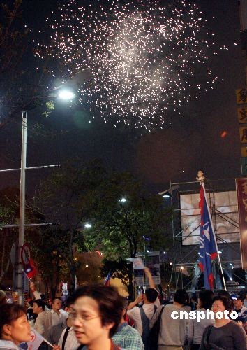 3月22日,中国国民党候选人马英九、萧万长在台湾地区领导人大选中以221万票的领先优势获胜。图为当日晚间在马萧竞选总部前的集会上,支持者放焰火庆祝。中新社发 黄少华 摄