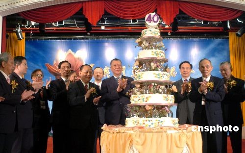 三月二十六日,澳门特首何厚铧、澳门中联办主任白志健、中国侨联主席林军等嘉宾在万豪轩酒家切开生日蛋糕,祝贺澳门归侨总会成立四十周年。中新社发 史利 摄