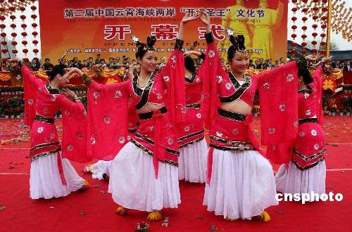 三月二十八日上午,第二届中国云霄海峡两岸“开漳圣王”文化节在福建漳州云霄县将军山开幕,古典舞、舞龙舞狮等民俗文化助阵表演。来自美国、澳大利亚、马来西亚、南非、泰国、新西兰、新加坡以及中国香港和台湾等十余个国家和地区的海内外嘉宾八百多人与会。中新社发 沈逸亭 摄