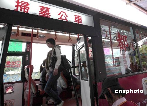 3月29日,台北市民搭乘免费扫墓公车前往墓园祭拜。临近清明,扫墓人潮逐渐增多,为避免重点墓区交通拥堵,台北市于3月29、30日及4月4、5、6日共计5天,辟出五条免费扫墓公车专线,供民众搭乘。中新社发 杜洋 摄