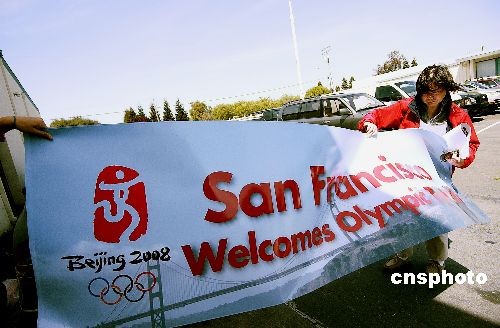 当地时间四月五日是北京奥运火炬旧金山站点传递前的最后一个周末,众多华人社区人士放弃周末休假,为迎接圣火的到来做最后的准备。图为黄河长江中文学校的顾丽青校长在检查刚刚取回的巨幅《旧金山迎奥运火炬》横幅的印刷质量。 中新社发 陈钢 摄