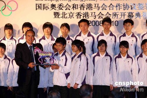 4月10日,香港马会在北京与国际奥委会博物馆签订《合作协议》,为未来成立“香港奥林匹克博物馆”,携手在港进一步宣传奥运理念、传播体育精神打下合作的基础。 双方同时还签署了一份《贡献机构协议》。根据该协议,马会将向国际奥委会博物馆进行捐赠以支持并宣扬奥林匹克运动。图为在仪式上香港学生向北京奥组委赠送礼物。中新社发 任海霞 摄