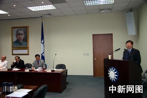 台湾地区当选领导人马英九14日在面对港澳媒体的记者会上证实,将由东吴大学校长刘兆玄出任“行政院长”。刘兆玄1943年5月出生,湖南省衡阳县人。1965年台湾大学化学系毕业,曾任台湾当局“交通部”部长、“行政院副院长”。2004年出任东吴大学校长,现任国民党中常委。图为2007年6月,刘兆玄在国民党中常会上就经贸问题作演讲。中新社记者 耿军 摄