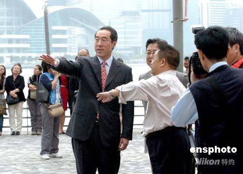 四月十八日,香港举行奥运火炬传送测试,香港政务司长唐英年在尖沙咀文化中心起步点视察奥运火炬传送测试。作者: 邓庆乐