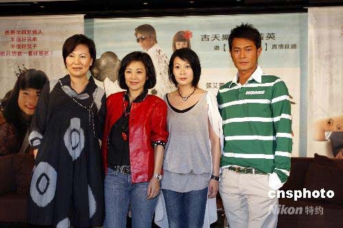 4月23日,张艾嘉(左二)带着奶茶刘若英(右二)、古天乐,以及片中客串的港星陶敏明在台北为爱情结晶喜剧《一个好爸爸》造势。本片由成龙亲自监制,是张艾嘉继《20.30.40》后筹备三年的执导力作。她在此片突破常规染指黑帮的花花世界,用丰富和幽默真挚情感打动观众,成为导演生涯中最有创作力一次。男女主角古天乐、刘若英饰演一对经历廿年爱情试炼的夫妻,激情有默契,隽永而清新。《一个好爸爸》将于4月25日在台湾公映。中新社发 杜洋 摄