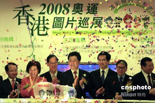 “精彩瞬间,永恒奥运-香港·2008奥运图片巡展”四月二十五日在香港中央图书馆开幕,近三百幅奥运图片将在全港进行九场展览,历时三个月。(左二起)北京奥组委新闻宣传部部长王惠、香港民政事务局局长曾德成、中央驻港联络办公室副主任李刚、外交部驻港公署副特派员杨子刚、香港奥林匹克委员会会长霍震霆等众多嘉宾出席主持开幕式。中新社发 王丽南 摄