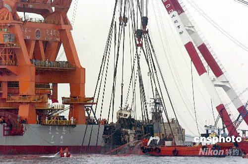 四月二十七日,由中国交通部广州打捞局派出的大型打捞船“华天龙”,在香港水域小磨刀东面,成功将沉没的乌克兰补给船的烟囱及驾驶舱部份吊出水面。中新社发 邓庆乐 摄