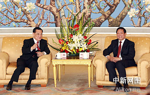 4月29日,中共北京市委书记刘淇在北京会见中国国民党荣誉主席连战。 中新社记者 廖文静 摄