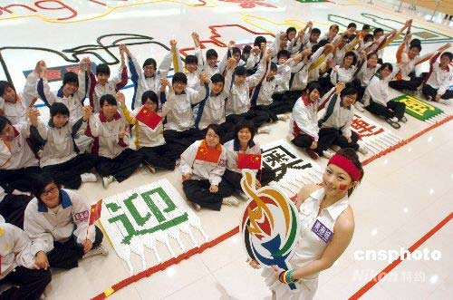 四月二十九日,香港将军澳东港城商场为迎接北京奥运的来临,特别举行“骨牌迎奥运倒数一百天”活动,以十万块骨牌砌成面积达三千平方呎的“奥运之城”。图为参与堆砌骨牌活动的学生在推倒骨牌后雀跃留影。中新社发 邓庆乐 摄