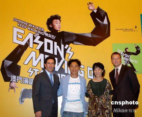 五月八日,香港歌星陈奕迅(左二)在澳门威尼斯人酒店出席个人世界巡回演唱会记者招待会,介绍其个人世界巡回演唱会最后一站的澳门演唱会将于七月十九日在澳门威尼斯酒店举行。中新社发 史利 摄