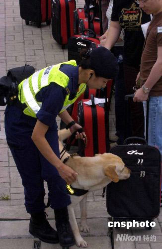 五月十日,香港落马洲海关警犬基地开放予公众参观。图为警犬进行模拟搜查违禁品的工作。落马洲海关警犬基地于二零零五年正式启用,有四只警犬驻守,为出入境管制站及货柜码头进行缉毒和搜查其它违禁品的工作。中新社发 谭达明 摄