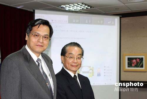 五月十三日下午,由“陆委会”主管的中华发展基金举行《雅音四书集粹》推介会。推介以古汉语音韵诵读的论语等“四书”。图为“陆委会”主委陈明通(左一)、台湾传统诗学会副理事长黄冠人在推介会上。中新社发 陈立宇 摄
