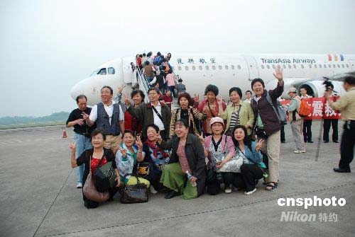 5月16日晚8时20分,165名被困九寨沟的台湾游客乘坐台湾复兴航空公司飞机离开重庆返台。从16日晚至17日凌晨,还将有台湾中华航空公司、长荣航空公司两架飞机飞抵重庆,转运近七百名在四川灾区被困台湾游客返家。图为即将返家的台胞们在重庆机场合影留念。中新社发 康祖斌 摄