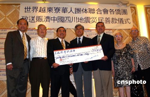 5月19日,世界越柬寮团体联合会600多位华人华侨在洛杉矶举办向汶川地震灾区募款活动,他们集体起立默哀3分钟,现场募款50万美金,当即交由中国驻洛杉矶总领事馆总领事张云(中)送汶川灾区。