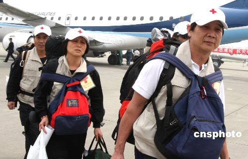 5月20日下午,以陈文长为领队的台湾红十字医疗队一行37人以“两岸直航”的形式乘坐台湾华信航空的专机抵达成都机场,之后即刻前往汶川大地震的重灾区德阳市开展医疗救治。中新社发 任晨鸣 摄