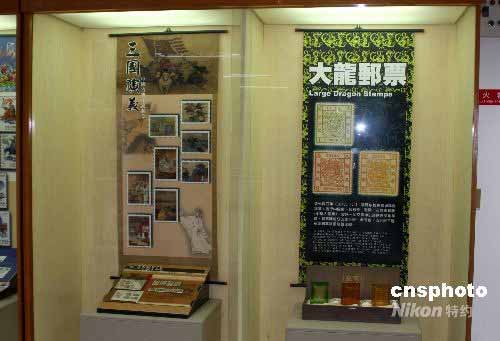 5月22日,台湾邮政博物馆中正在展出的清朝大龙邮票和三国演义套票。中新社发 陈立宇 摄