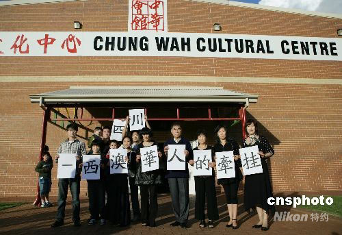 当地时间5月25日下午四时,西澳大利亚华人聚集在中华文化中心,举办“祈福零八,平安中国”活动为四川地震募集善款。其中,来自河南同乡会的华侨打出了“四川——西澳华人的牵挂”的标语。中新社发 高周丹 摄