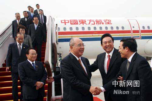 5月27日,中国国民党主席吴伯雄率领的大陆访问团乘包机抵达北京首都国际机场,中共中央台湾工作办公室主任陈云林、中共北京市委副书记王安顺等到机场迎接。作者:盛佳鹏