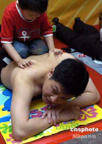 六月五日,香港一商场举行“感恩父亲节”活动,邀请几名小朋友为父亲擦背按摩,预祝甜蜜父亲节的来临。中新社发 谭达明 摄
