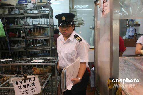 六月七日,香港一名工作人员对铜锣湾街市一家活鸡摊档进行巡查。香港食物及卫生局局长周一岳当日表示,确定月初在保安道街市抽取的五个鸡只样本,带有H5N1禽流感病毒,特区政府对禽流感的应变级别将由原来的“戒备”级别,升为“严重”级别。中新社发 武仲林 摄