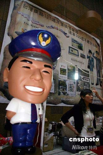 一座“台湾铁路公仔”亮相台北火车站,吸引路人。