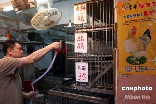 六月九日,香港各街市活鸡摊档提前两天进行休市清洁,预防禽流感。六月七日,香港保安道街市的五个鸡只样本,确认带有H5N1禽流感病毒,特区政府将禽流感的应变级别提升为“严重”级别。中新社发 武仲林 摄