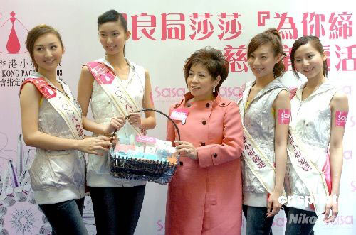 六月二十日,二零零八年香港小姐十二位候选佳丽,在香港出席保良局与莎莎化妆品公司合办的“为你缔造美丽人生”慈善义卖活动。同场一至四号候选佳丽文柏姿、伦紫玄、张舒雅、高海宁(右起)获颁“最具智慧佳丽”奖项,由莎莎化妆品有限公司副主席郭罗桂珍颁赠奖品。中新社发 邓庆乐 摄
