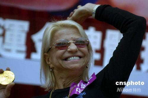六月二十六日,俄罗斯“体操之母”高拔出席香港记者会。北京奥运日渐临近,香港多个商场开展一系列迎奥运活动,这次奥运体操四面金牌得主有“体操之母”之称的高拔(OlgaKorbut)首度率团来香港表演。中新社发 谭达明 摄