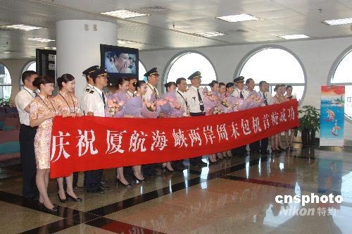7月4日,作为首架降落台北松山机场大陆民航客机,从松山乘载202位客人返抵厦门高崎场后,厦航MF-881班机全体驾乘人员合影庆贺往返分别以80分钟时间正点执乘。机长沈志群介绍,航班抵达台北松山机场时,受到当地各界以“迎风洗尘”为主题的礼遇迎接。中新社发 郑祚声 摄