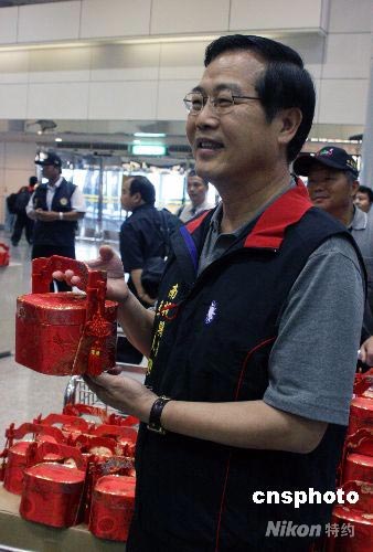 7月4日,大陆居民赴台旅游及两岸周末包机同时启动。时隔59年后,两岸间首次有600多位大陆游客循正常渠道于当日到台湾旅游,实现了两岸民众的双向旅游。陆客抵台,台湾台北县、桃园县和南投县等多个县市争先欢迎。南投县长李朝卿亲自在桃园机场入境口向大陆游客致赠纪念品。中新社发 黄少华 摄