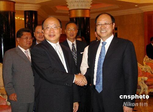 七月七日中午,中共中央台办、国台办常务副主任郑立中(前右),在厦门亲切会见搭乘周末包机从台中首航厦门的台中市市长胡志强(前左)一行。图为两人热烈握手致意。中新社发 杨伏山 摄