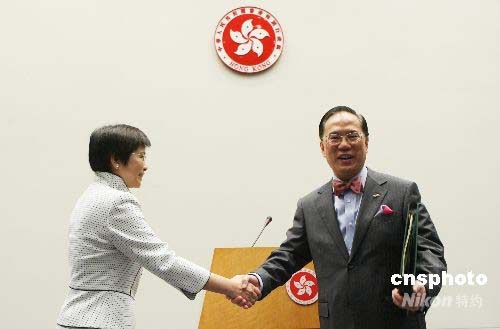 七月十二日,国务院决定,任命刘吴惠兰为香港特别行政区商务及经济发展局局长,免去马时亨的商务及经济发展局局长职务。图为当日香港特别行政区行政长官曾荫权与刘吴惠兰在政府总部出席记者会。中新社发 武仲林 摄