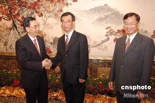 中国国民党高雄市委员会广州访问团一行,七月十二日搭乘高雄至广州周末包机抵穗。中共广州市委书记朱小丹(左一),在广州东方宾馆会见该访问团全体成员。中新社发 柯小军 摄