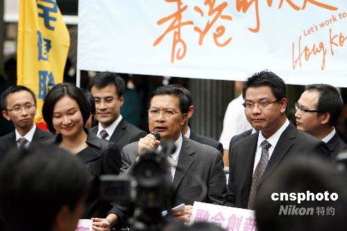 七月十七日,香港民建联在遮打花园造势,向传媒介绍二十九位参加九月的立法会地区直选的参选人。香港民建联主席谭耀宗表示,希望在九月的立法会选举中,能保持十二个席位的数目。中新社发 洪少葵 摄