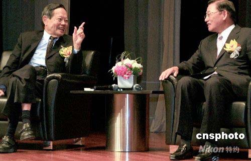 7月17日,第三届“两岸论坛”“台海新局与两岸经贸发展”论坛在香港会展中心举行。图为海峡交流基金会董事长江丙坤博士(右)与诺贝尔物理学奖获得者中央研究院院士杨振宁博士(左)出席论坛并愉快交谈。中新社发 张勤 摄
