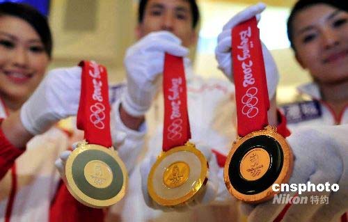 七月二十四日,北京奥运会采用的“金镶玉” 奖牌在香港展示。奖牌正面用国际奥委会规定图案,背面镶嵌着中国古代龙纹玉璧造型的玉璧,背面正中镌刻北京奥运会徽。中新社发 谭达明 摄