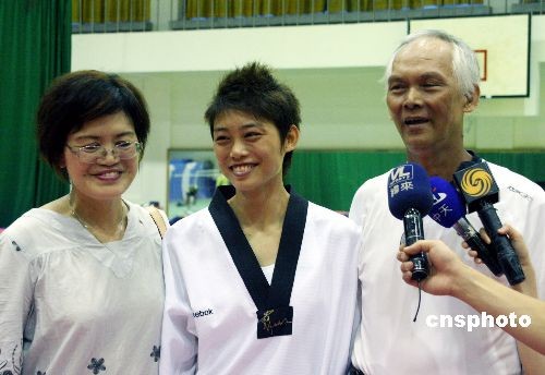 中华台北队选手们目前正在高雄左营训练中心加紧训练,准备以最好的状态,备战北京奥运。图为跆拳道队员苏丽文(中)与父母接受媒体采访。其父母表示届时将赴北京,到现场为女儿加油。中新社发 黄少华 摄