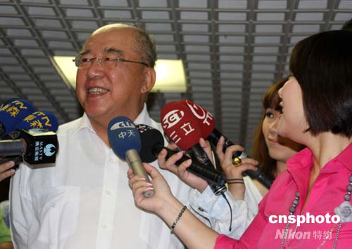7月26日,中国国民党主席吴伯雄在台北参与国民党中常委选举投票后接受记者采访,笑着重申将应邀参加北京奥运会。中新社发 董会峰 摄