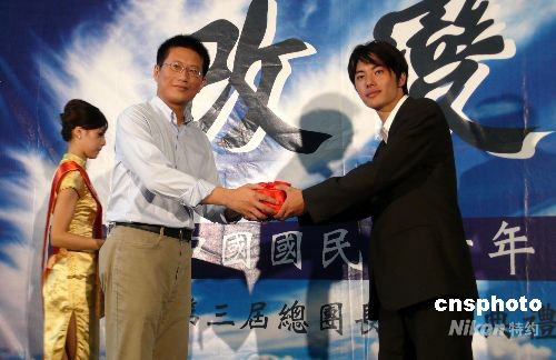 7月30日,国民党史上最年轻中常委现年25岁的梁靧在台北亮相。梁靧是台湾政治大学哲学研究所一年级学生,日前当选中国国民党青年团总团长,成为国民党有史以来最年轻的中常委。图为当日梁靧(右)出席国民党青年团总团长交接仪式,并出席国民党中常会。中新社发 董会峰 摄