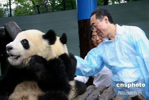 8月1日下午,香港政务司司长唐英年率考察团,前往中国第三大大熊猫圈养中心——中国保护大熊猫研究中心雅安碧峰峡基地实地考察。他重点考察了熊猫幼儿园、繁殖区等,询问地震后基地熊猫的生活、健康、繁殖情况。中新社发 蒋艳英 摄