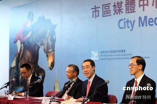 八月七日,香港特区政府就举行奥运马术有关事宜召开记者会,身兼奥运马术委员会主席的政务司司长唐英年表示,香港出售的十二万张马术赛门票全部售罄,反应热烈是出乎意料。今届有四十二个国家及地区选手,以及二百多匹参赛马匹参加,打破历届的参赛纪录。中新社发 洪少葵