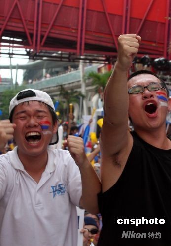 8月16日,征战北京奥运的中华台北棒球队奋战九局,0:1惜败劲旅古巴,三连败后出线前景渺茫。当日,数以千计的台湾球迷聚集台北东区观看大屏幕直播,图为现场两名狂热的年轻人。中新社发 董会峰 摄