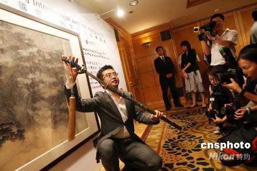 九月十日,香港国际艺展公司向传媒展示一把明朝宫廷的“龙泉宝剑” ,据称该宝剑是目前市场上仅存的珍罕之物,估计拍卖价在二千万港元。该公司主办的“2008香港国际古玩及艺术品博览会”将在十月四日至七日在会展中心举行。中新社发 洪少葵 摄