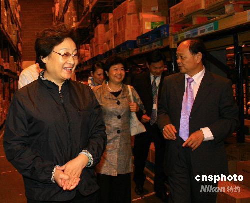 当地时间11日下午,抵英访问的中国国务院侨办主任李海峰前往当地华商企业“泗和行”,现场了解其经营与发展状况。图为李海峰(左)在泗和行老板谢贵全(右)的陪同下,参观其现代化仓储基地。中新社发 李鹏 摄