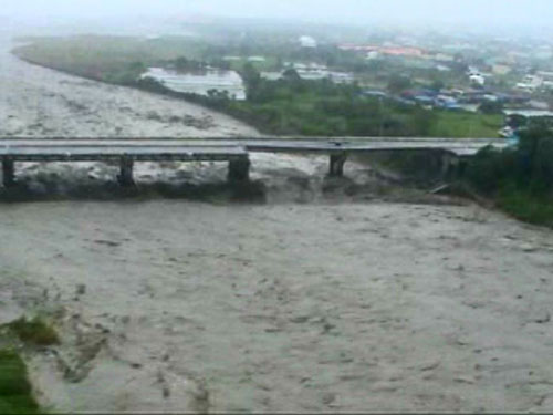 因森拉克台风豪雨影响,台湾台中县后丰大桥日前发生断裂垮塌,造成三车六人坠落桥下遭滚滚洪水冲走惨剧。图为空中勤务总队直升机空拍断桥全景的镜头。“中央社”图