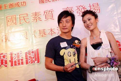 由香港政制及内地事务局赞助,国民教育中心策划,有关基本法及发扬奥运精神系列活动即将在香港推出。九月二十日,参与“一国两制”与“基本法”广播剧演出的影视红星方力申、周丽淇出席记者会与青少年分享心得。中新社发 洪少葵 摄