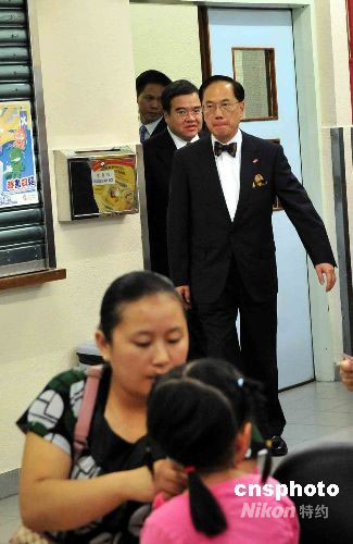香港特区行政长官曾荫权二十三日下午,前往油麻地赛马会分科诊所,了解受三聚氰胺奶品事件影响儿童的检验情况。中新社发 谭达明 摄