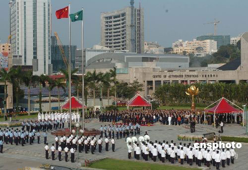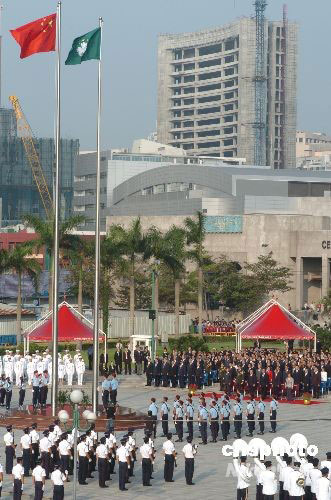 十月一日上午八时,澳门各界在金莲花广场举行隆重升国旗、区旗仪式,庆祝中华人民共和国成立五十九周年。中新社发 毕永光 摄