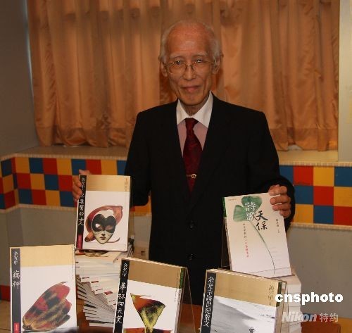 为祝贺诗人余光中八十大寿,台湾九歌出版社特意出版余光中最新诗集《藕神》、近十年的文学评论精选《举杯向天笑》、翻译英国名作家王尔德的剧本《不要紧的女人》等五本书,展现他在文学路上的成就。十月二日,台湾艺文界提前为他祝寿,余先生在五本新书前留影。中新社发 耿军 摄